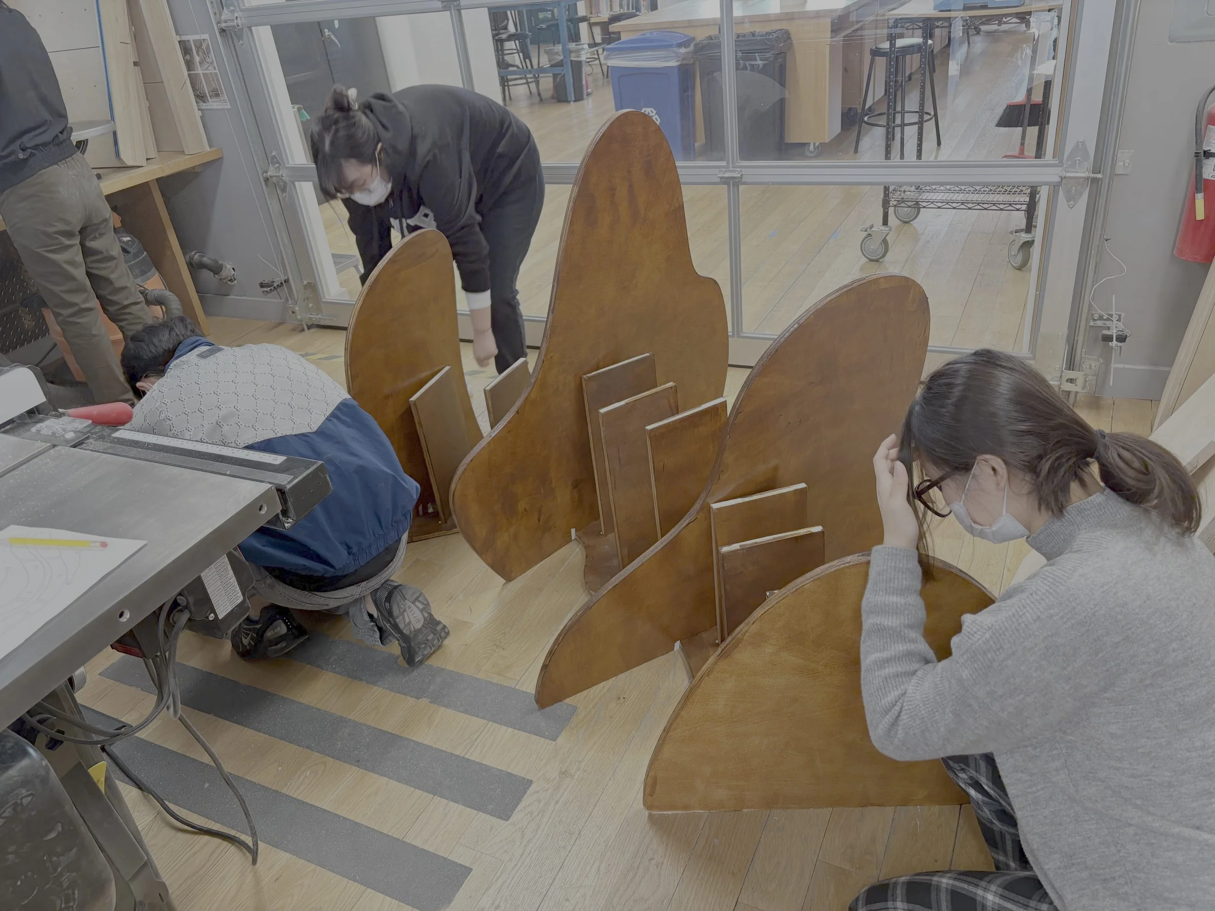 Before assembly, we worked on finishing the panels. After machine sanding, we hand-sanded every edge to make them smooth and rounded, preventing splinters and ensuring a comfortable touch. We then applied a coat of wood stain to bring out the natural grain and add protection, followed by layers of wax