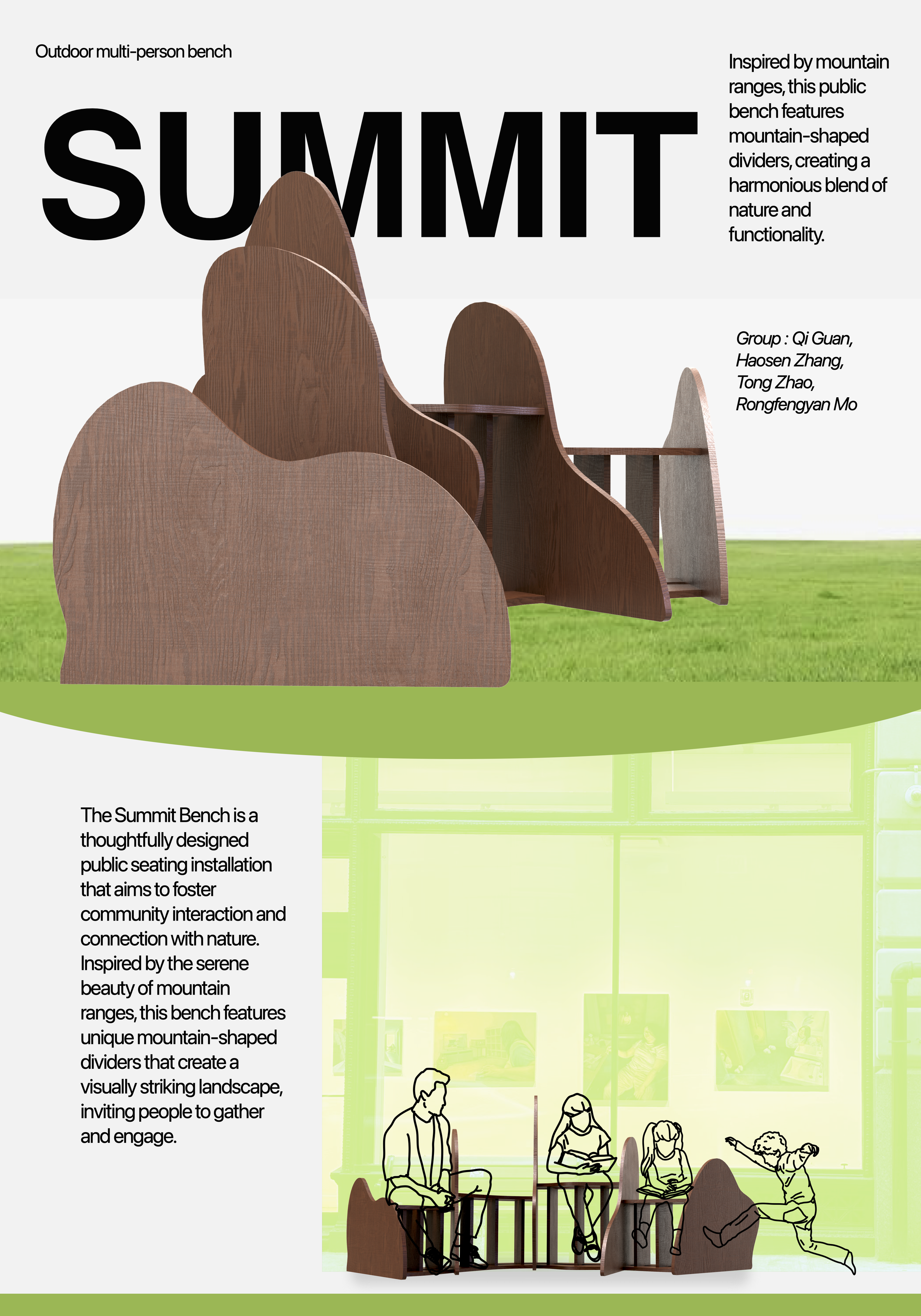 The Summit Bench is composed of wooden seats divided by mountain-shaped partitions, which from a distance connect visually into a continuous range. This sculptural form transforms ordinary seating into a landscape that suggests both separation and connection: while the dividers provide personal space, the overall silhouette invites people to feel part of a shared environment. Intended for parks, campuses, and public squares, the bench offers not only a place for rest and social interaction, but also an opportunity to pause, reflect, and experience a subtle connection to nature within the urban setting.