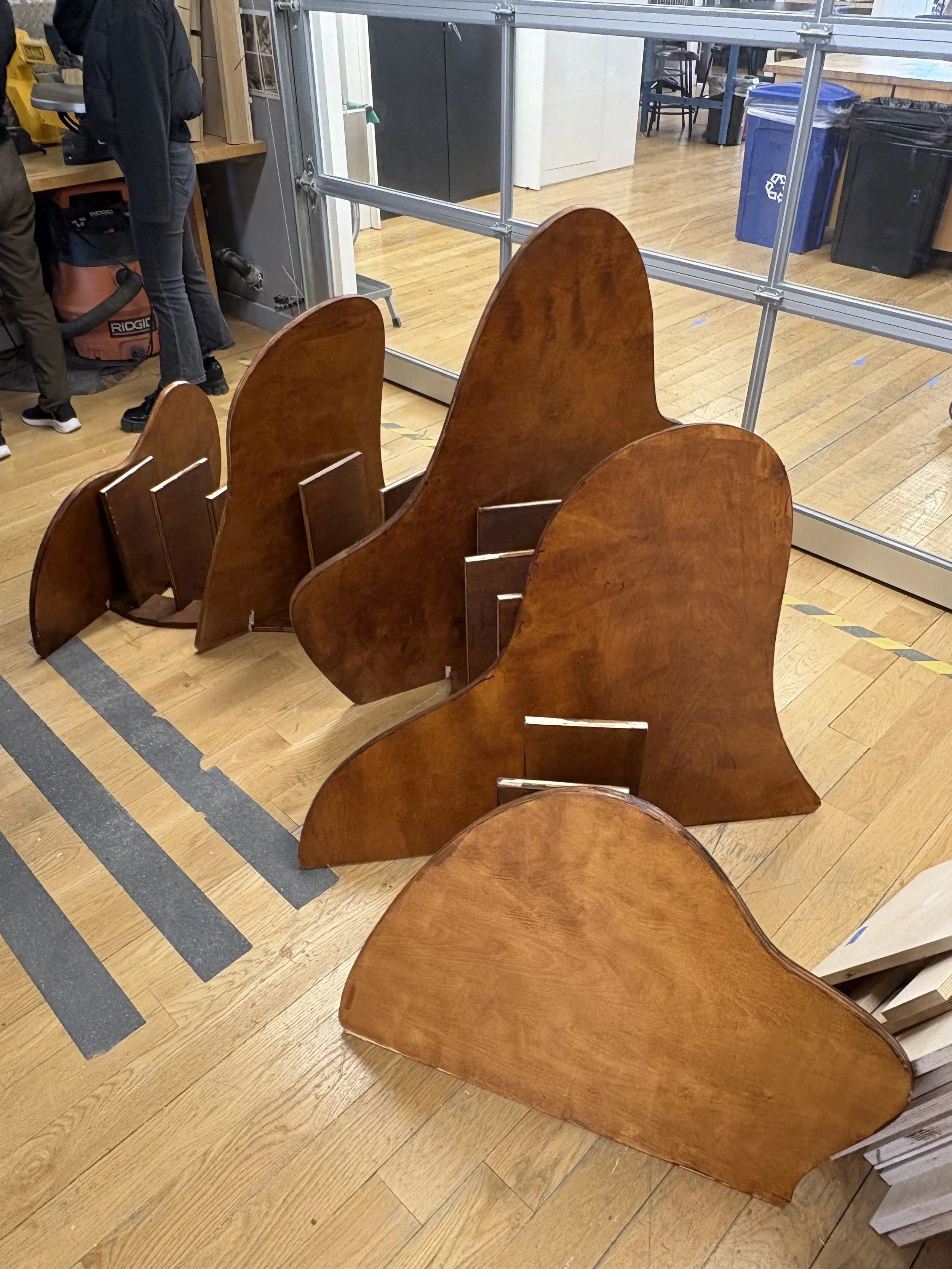 The Summit Bench is built from seven mountain-shaped partitions and 44 wooden panels. Each partition was CNC-cut with slots, allowing the panels to slide in and interlock to form both the seating surface and the frame.